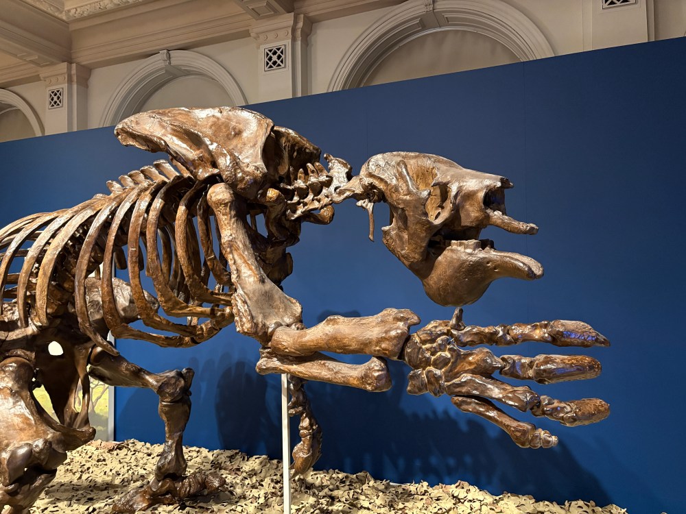 From a visitor perspective, large 3D reconstructions are usually visually convincing but inherently speculative in aspects such as integument, colouration, display structures and some soft-tissue reconstructions. For taxa like Gigantopithecus or Paraceratherium, the fossil record provides solid osteological anchors, but soft-tissue inferences depend heavily on phylogenetic bracketing and functional analogy. The exhibition gets around these with their design of the extinct species being a little more square than they would be in life, constructed of painted wooden panels which helps to work around these uncertainties. The exhibition text largely stays consistent with its own labels, but additional curatorial notes for those intrigued by taxonomic history would be valuable. The exhibitions central theme is size (understandably given the title) but size alone is an incomplete explanatory variable. Life history traits (growth rates, age at maturity, reproductive output, juvenile mortality) critically determine population dynamics and extinction vulnerability. The exhibition touches on these points in broader strokes (e.g. vulnerability of large vertebrates) but does not provide quantitative comparisons (e.g. generation times of mammoths vs. megafaunal competitors; estimated population densities). Including accessible graphical summaries (log-scaled body mass vs. expected population density, or simple allometric scaling plots) would deepen scientific understanding without alienating lay visitors. This is an important consideration given the hypotheses surrounding the overhunting of these large animals by humans.